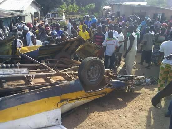 « C’est un minibus qui a quitté Kacossa dans Forécariah pour Fria pour un mariage. Arrivé à Yoropoguia dans Dubréka, le chauffeur du minibus a tenté de doubler un motocycliste d’où il s’est retrouvé en troisième position avant de rentrer en collision avec un camion benne transportant du sable » explique t-il.