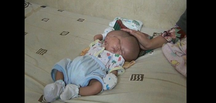 Gilang Andika, âgé de deux mois seulement a un visage presque déformé et souffre d’une maladie cérébrale potentiellement fatale appelée hydrocéphalie. Cette maladie provoque l’accumulation de liquide dans son cerveau.