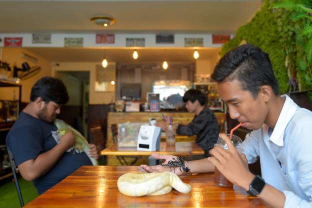 Terrifiés par les scorpions et pythons albinos? Un Cambodgien vient d'ouvrir un café qui leur est consacré à Phnom Penh afin de permettre d'approcher, voire de caresser, ces animaux "incompris". Il s'agit du premier bar de ce type au Cambodge, mais le modèle fait déjà fureur ...