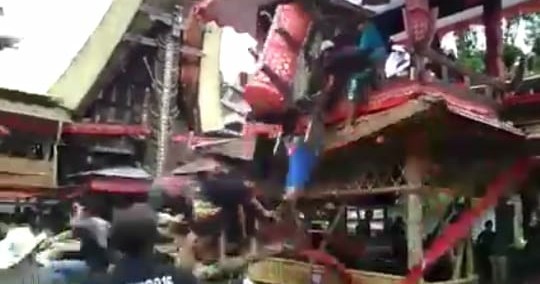 Le drame s'est produit vendredi dans le sud-ouest de l’île des Célèbes, en Indonésie. Samen Kondorura, 40 ans, assistait aux obsèques de sa mère à Parinding. Les fossoyeurs hissaient le cercueil sur une échelle pour le placer sur une tour funéraire. L’échelle ...