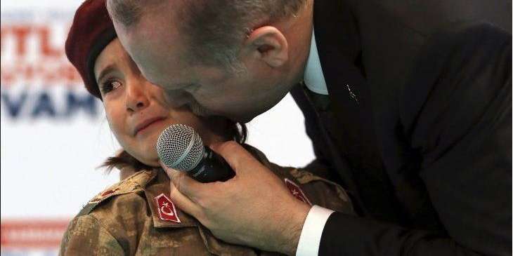 En plein meeting de son parti, Recep Erdogan a fait monter sur scène une fillette vêtue d’un uniforme militaire. Il a assuré à cette dernière qu’elle serait honorée si elle tombait en martyre. La scène s’est déroulée le 24 février dernier, lors d’un cong ...
