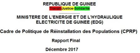 REPUBLIQUE DE GUINEE Travail-Justice-Solidarité MINISTERE DE L’ENERGIE ET DE L’HYDRAULIQUE ELECTRICITE DE GUINEE (EDG) Cadre de Politique de Réinstallation des Populations (CPRP) Rapport Final Décembre 2017 Table des matières SIGLES, ABREVI ...