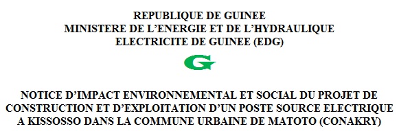 REPUBLIQUE DE GUINEE MINISTERE DE L’ENERGIE ET DE L’HYDRAULIQUE ELECTRICITE DE GUINEE (EDG) G NOTICE D’IMPACT ENVIRONNEMENTAL ET SOCIAL DU PROJET DE CONSTRUCTION ET D’EXPLOITATION D’UN POSTE SOURCE ELECTRIQUE A KISSOSSO DANS LA COMMUNE URBAINE DE MATOTO (CONAKRY)