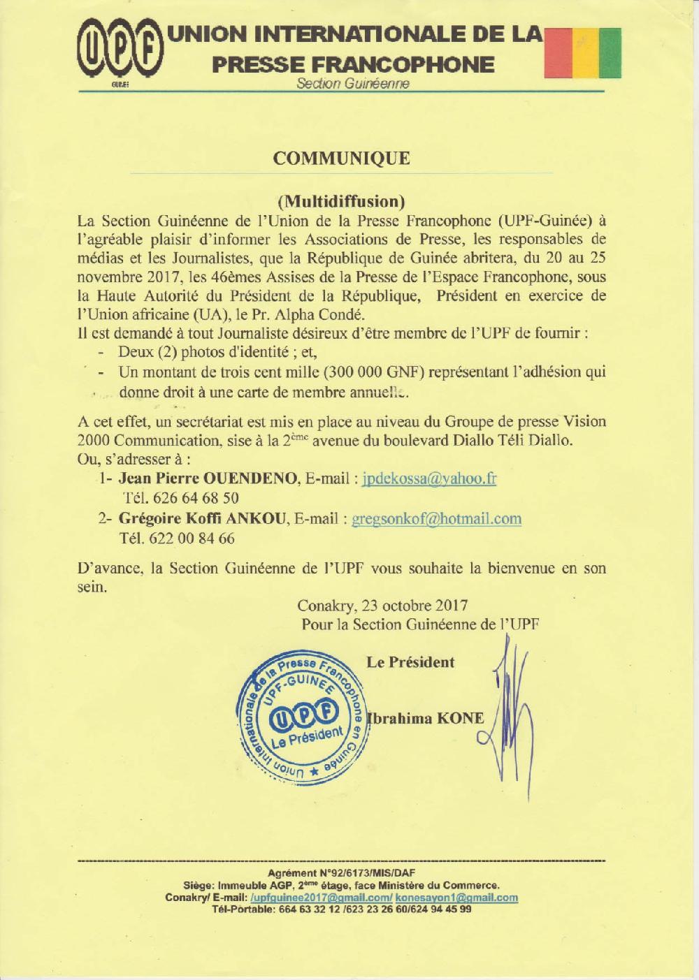 La Section Guinéenne de l’Union de la Presse Francophone (UPF-Guinée) à l’agréable plaisir d’informer les Associations de Presse, les responsables de médias et les Journalistes, que la République de Guinée abritera, du 20 au 25 novembre 2017, les 46èmes Assises de la Presse d ...